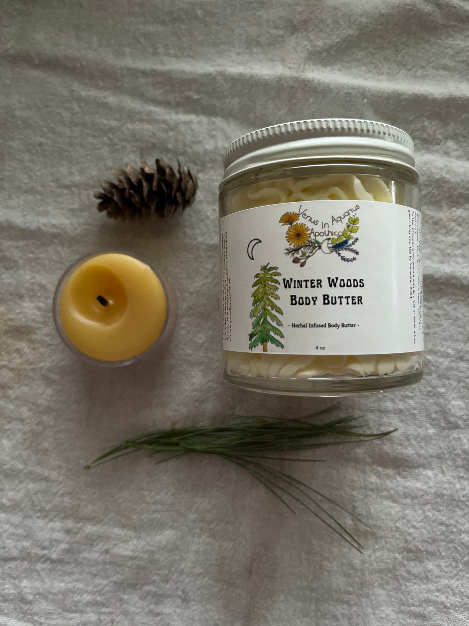 Coming back for 2025! A deeply decadent body butter with slightly scented coniferous scent. The intention behind this body butter was to create a deeply effective moisturizing skin treat but without the heaviness of most body butters. We nourishing butters, and marshmallow root which are demulcent by nature.